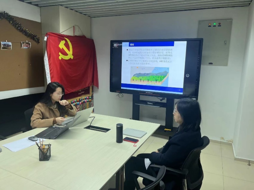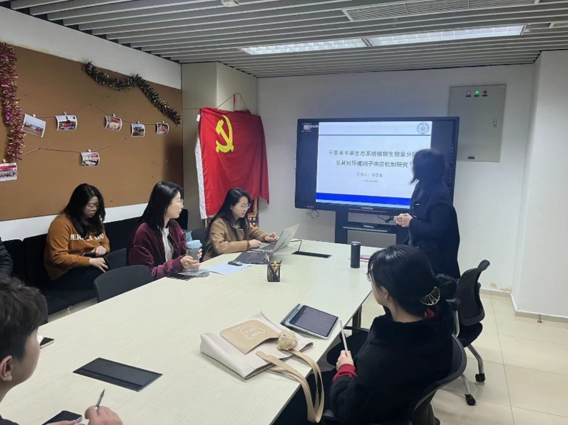 冯思远同学汇报的题目为“干旱半干旱生态系统植物生物量分配及其对环境因子响应机制研究”,她以内蒙古草原的干旱、半干旱和半湿润地区为研究区,在2020年7月初至8月中旬共调查了37个样地,每个样地设置了4条样带,整个样带约3000km,共获得了植物数据6000余条,土壤实验数据2000余条。综合运用结构方程模型评估了干旱半干旱生态系统植物生物量分配及其对环境因子响应。研究发现植物在不同的降水利用效率下根冠比有显著的差异,植物在LPUE模式下趋于向地下生长,植物在HPUE模式下趋于向地上生长,此外研究发现LPUE模式下主要受水分影响,在HPUE模式下主要受生物多样性的影响。冯思远同学的汇报结束,在场师生进行热烈讨论。在场同学提出数据分析方法的问题,师生就汇报内容与问题共同讨论,现场讨论热烈。