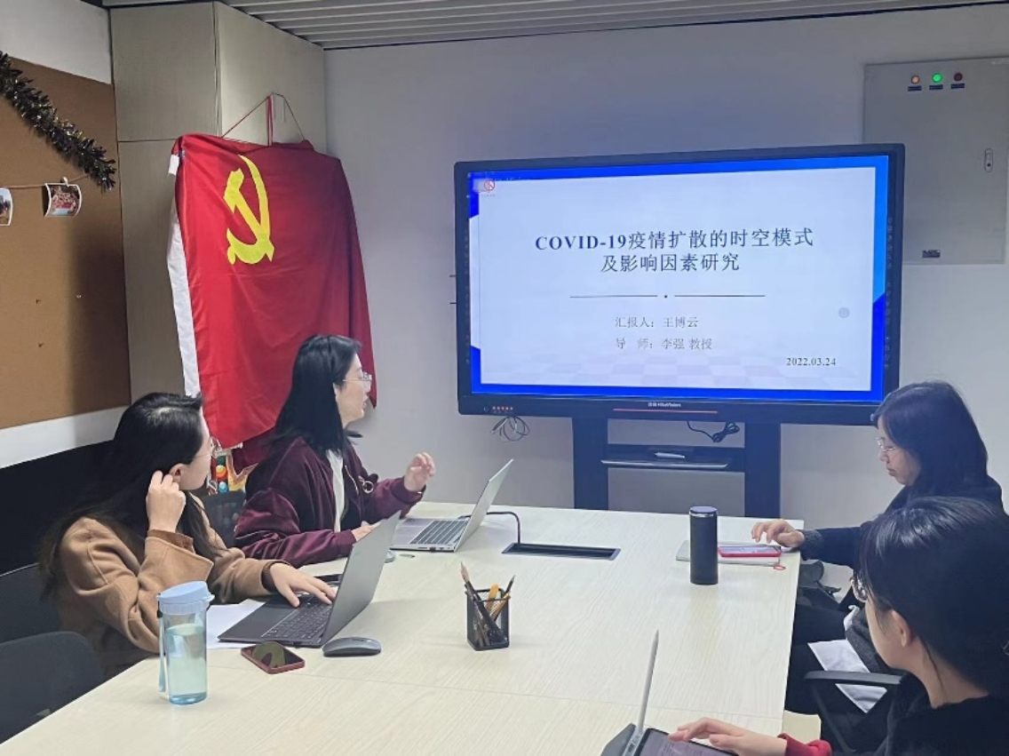 王博云同学的汇报的题目为“COVID-19疫情扩散的时空模式及影响因素”,她的研究首先对疫情扩散的空间模式判别提出了两个假设分析了疫情扩散的时空模式,结果发现蔓延型地区主要位于黄河以南,集中连片分布于湖北省的东北和东南方向。然后利用多元Logistic回归模型探究了首发地对于各城市的空间扩散模式的影响,结果发现COVID-19疫情不同空间模式的疫情扩散过程受到不同因素的影响,与武汉市的通航状况对近距离和远距离蛙跳型;人口关联度对蔓延型和近距离蛙跳空间模式起到了正向作用;迁出人口数量对于近距离和与远距离蛙跳型空间模式均存在显著的影响作用。汇报完毕,老师同学们积极讨论,有的同学对于该研究方法在全球疫情扩散的时空模式进行推广的提出了建议,王博云同学一一进行解答,和在场人员展开了热烈讨论。