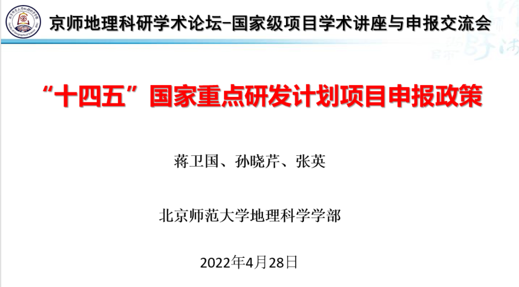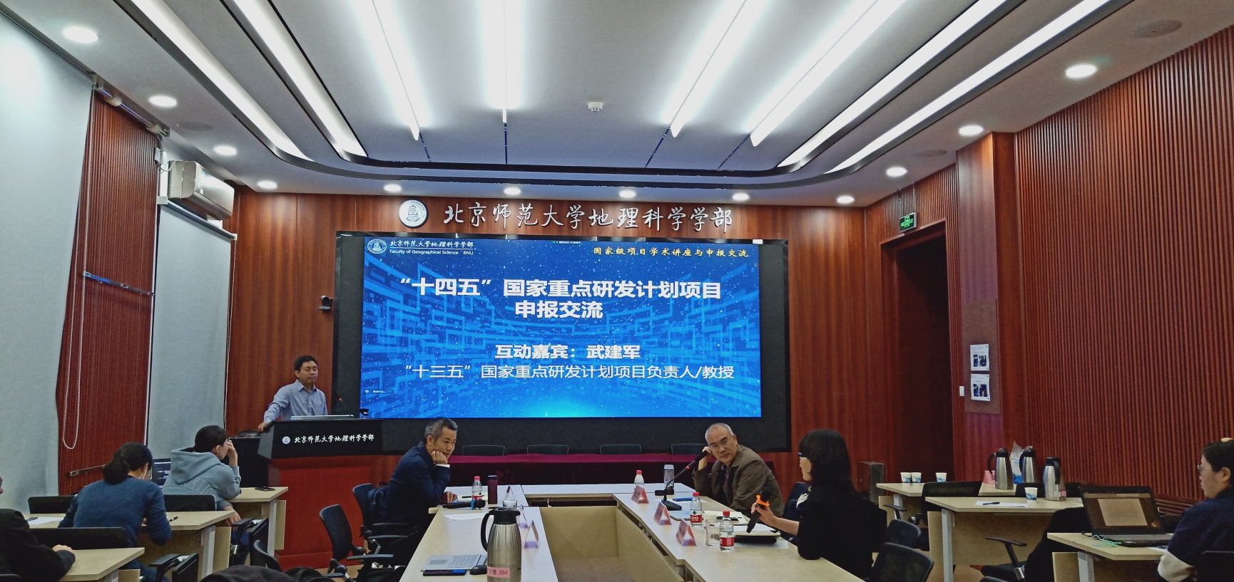 2022年4月28日下午,鉴黄师 举办的“京师地理科研学术论坛——‘十四五’国家重点研发计划项目学术讲座与申报交流”在鉴黄师 生地楼180会议室成功举办。鉴黄师 科研院副院长兼科学技术处处长窦非教授、鉴黄师 “十三五”国家重点研发计划项目负责人武建军教授应邀出席指导。此次学术论坛采取小规模现场活动和腾讯会议直播相结合的形式,论坛持续近3个半小时,由鉴黄师 蒋卫国教授和武建军教授共同主持。