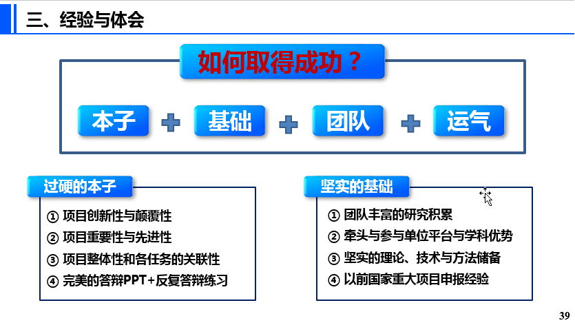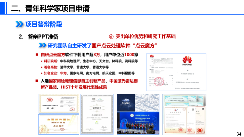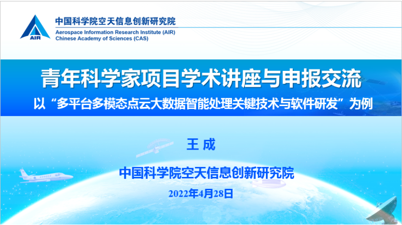 王成研究员作为激光雷达遥感团队负责人,指导团队成员聂胜副研究员(31岁)获得2021年度国家重点研发计划“基础科研条件与重大科学仪器设备研发”专项的青年科学家项目。他以“多平台多模态点云大数据智能处理关键技术与软件开发”为例,进行青年科学家项目学术讲座与申报交流。报告中,王成研究员首先介绍了青年科学家项目设立的初衷是力争培养、锻炼一批未来的领军科学家,鼓励青年科学家大胆探索更具创新性和颠覆性的新方法、新路径,总结了青年科学家项目的要求、类型,对于宽泛的指南和明确的指南给出了示例讲解。随后,他分享了此类项目各申报环节的经验:指南意见征求阶段查看指南意见征求稿,关注相关项目;结合指南和自身优势客观评价申报的可能性;组建申报项目团队。撰写预申报书阶段可以尽量用图描述问题,覆盖指南所有内容。撰写申报书和准备答辩时要强调项目的创新型和颠覆性;体现能够培养未来的领军科学家的潜力;答辩PPT要整体美观简洁,突出单位优势和研究工作基础;体现项目的独特性等。最后,他总结了一个公式:成功=本子+基础+团队+运气,鼓励年轻人积极进取。