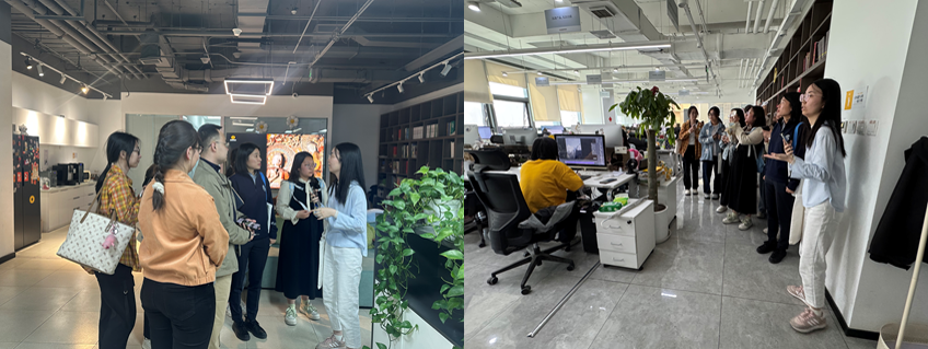 学部师生一行首先参观了星球研究所的工作环境,实地感受到良好的办公氛围。在工作人员的热情接待和讲解下,师生参观了企业剪辑室、录音室及各部门办公区,初步了解了企业的组织架构和业务范围。