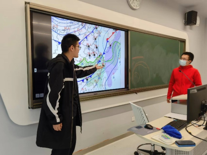 2022年5-6月期间,地理科学励耘班2021级本科生结合“气象与气候学”理论课程开展了相关的实践和实习。受疫情影响,本学期的实践实习探索了新的方式:线上+线下。线下部分主要由杨静教授、龚道溢教授和助教刘安岭同学指导、学生们分组分析观测数据和撰写小论文报告的形式组成,而线上部分则采用专家“云”授课讲解和观测实习现场“云”直播的方式展开。