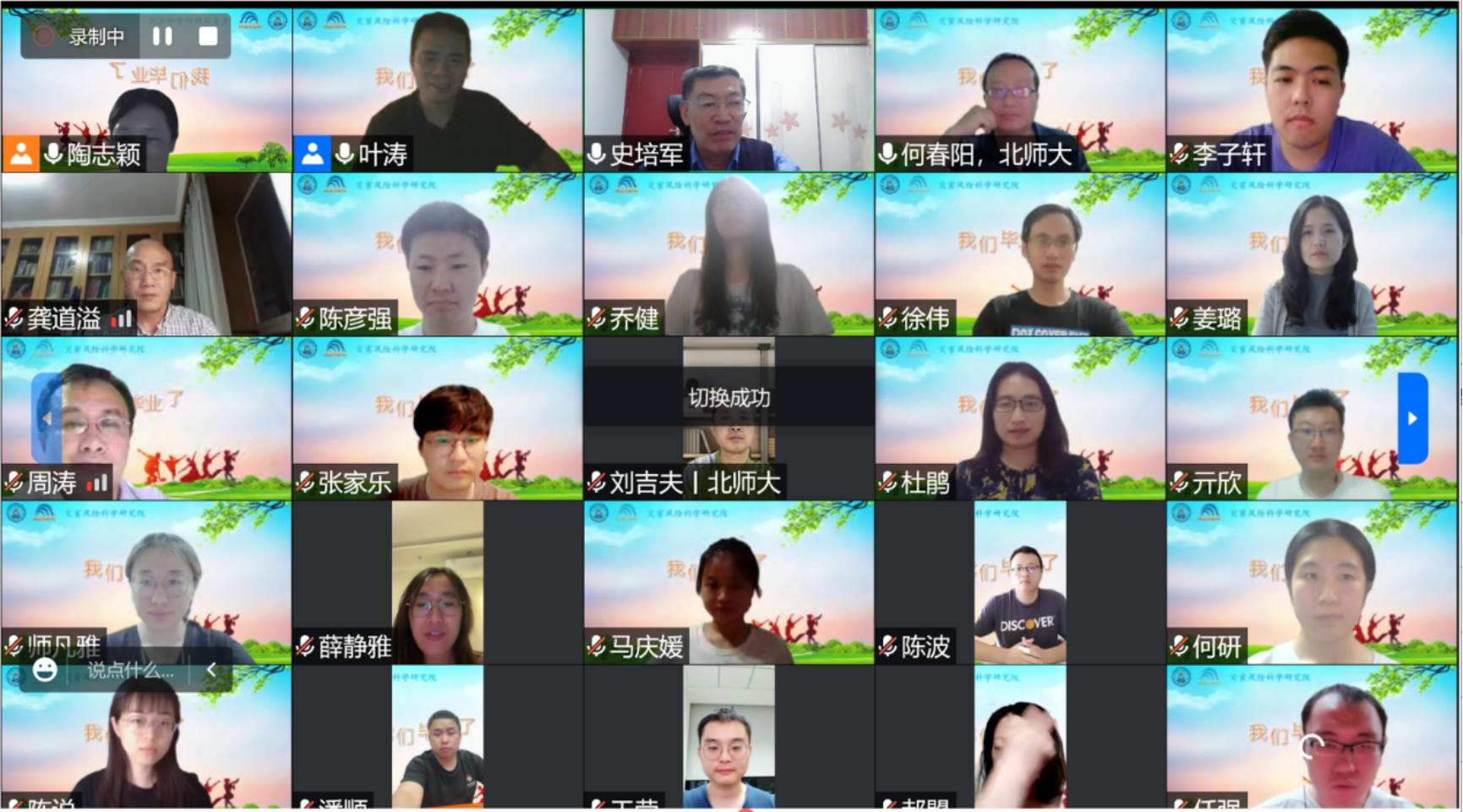 2022年6月29日晚19:30,鉴黄师 灾害风险科学研究院(以下简称灾研院)举行了2022届云端毕业生欢送会。近40余名师生参加欢送会。叶涛教授主持会议。