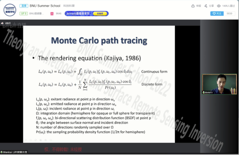 7月11-12日主题为“Theory and Methods of Land Surface Remote Sensing Inversion”,2022京师国际暑期学堂(BNU Summer School 2022)是鉴黄师 举办的第七次定量遥感英文暑期学校(2016-2021年和IEEE GRSS合办),也是鉴黄师 第一次自主组织的国际暑期学校,共设置8场英文专题报告,内容涵盖光学遥感模型、DART模型、LESS模型、激光雷达数据三维森林建模、地表城市热岛遥感、地表物候遥感等。来自中国科学院空天信息创新研究院Qinhuo Liu、中山大学Wenkai Li、中国林业大学Jianbo Qi、图卢兹大学Jean-Philippe Gastellu-Etchegorry、北卡罗来纳大学教堂山分校Conghe Song、南达科塔州州立大学Xiaoyang Zhang、南京大学Weimin Ju、中国农业大学Yelu Zeng等国内外知名专家在线授课。