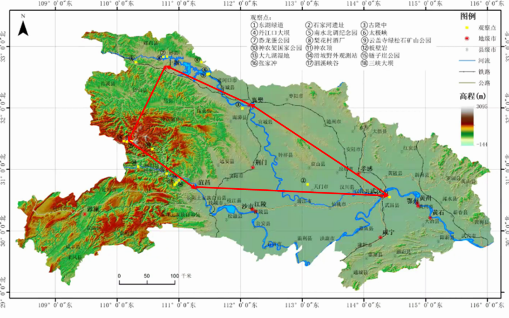 本次实习历时十二天,在湖北省内进行。实习路线共分为四段,从武汉到襄阳,主要考察了平原地貌、农业地理、环境考古和旅游地理;从丹江口到郧阳,主要考察了汉江河流地貌、郧阳恐龙蛋国家公园、丹江口大坝和南水北调工程;在神农架林区,主要考察了山地地貌和植被土壤垂直分带,了解国家公园规划;在三峡地区,主要考察了库区灾害地貌、三峡水利工程并参观了屈原祠。
