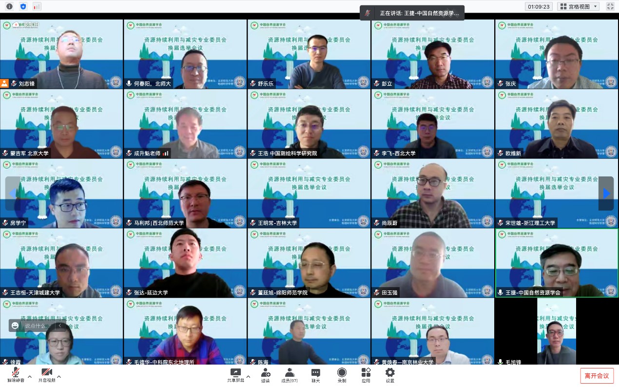 2022年11月19日,中国自然资源学会资源持续利用与减灾专业委员会换届大会以线上形式顺利召开。中国自然资源学会理事长成升魁研究员和中国自然资源学会执行秘书长沈镭研究员出席会议。何春阳教授当选为第六届中国自然资源学会资源持续利用与减灾专业委员会主任。会议由中国自然资源学会副秘书长王捷主持,来自全国65所高校/科研机构的113名代表参加了会议。