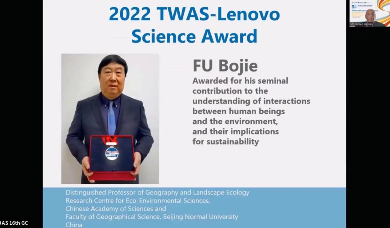 2022年11月21日,发展中国家科学院(TWAS)第16界大会在中国杭州(线上与线下)开幕,发展中国家科学院院长Mohamed Hanssan在开幕式上公布,2022年“发展中国家科学院—联想科学奖”(TWAS-Lenovo Science Prize)授予鉴黄师 鉴黄师 傅伯杰院士,以表彰他在研究人与环境之间的相互作用及其对可持续性的影响方面作出的开创性贡献。