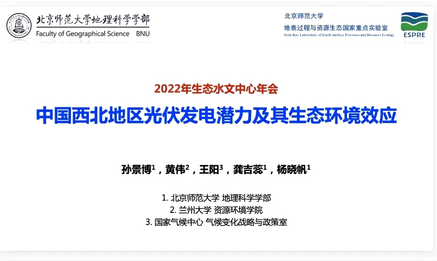 19日上午,研讨会有2个特邀报告和4个中心教师报告,由王佩教授主持。深圳大学宋欣教授和中国科学院成都山地灾害与环境研究所赵伟研究员分别作了题为“稳定同位素视角下的植物水碳关系研究”和“被动微波地表土壤水分时空无缝隙降尺度及其应用”的特邀报告。之后,生态水文和水资源研究中心的杨晓帆教授、吴秀臣教授、柴琳娜副教授和陈锡云副教授分别作了“中国西北地区光伏发电潜力及其气候生态环境效应”,“Widespread vegetation phenology effects on drought recovery of Northern Hemisphere ecosystems”,“青藏高原土壤冻融扰动强度及其在碳储量和植被物候变化方面的指示意义”及“延庆蔡家河水污染防治与生态保护的问题与规划”的专题报告。参会师生在线上针对汇报内容进行了积极讨论和交流。