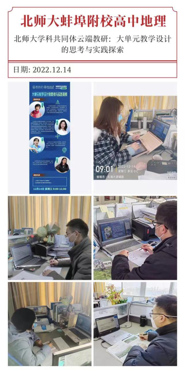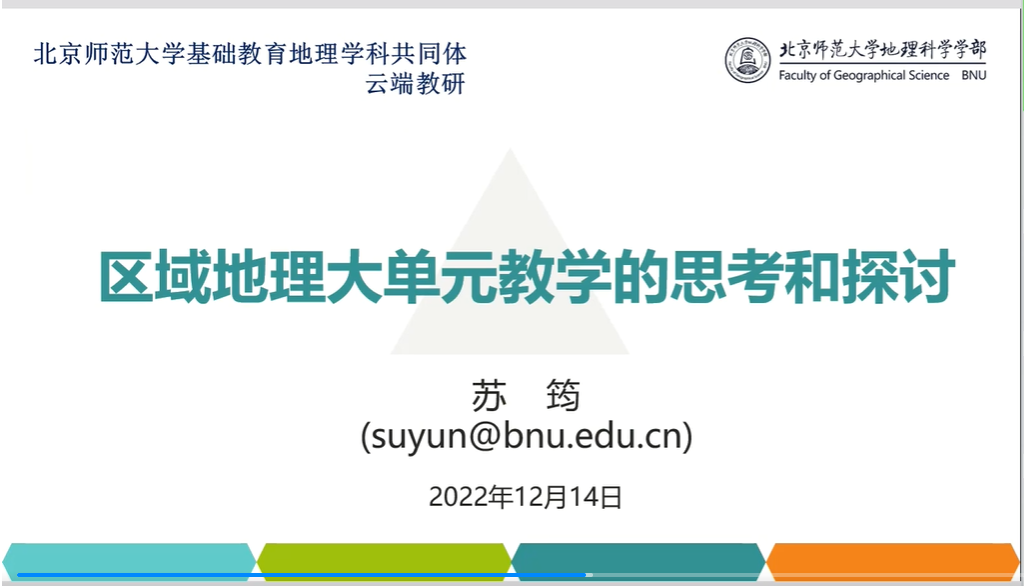 2022年12月14号上午,北师大基础教育地理学科共同体系列活动之“云端教研”活动成功举办。本次教研活动是高中云端教研的第三次活动,主题为“大单元教学设计的思考与实践探索”,共有357位北师大附校的教师们通过云端相连,教研共享。