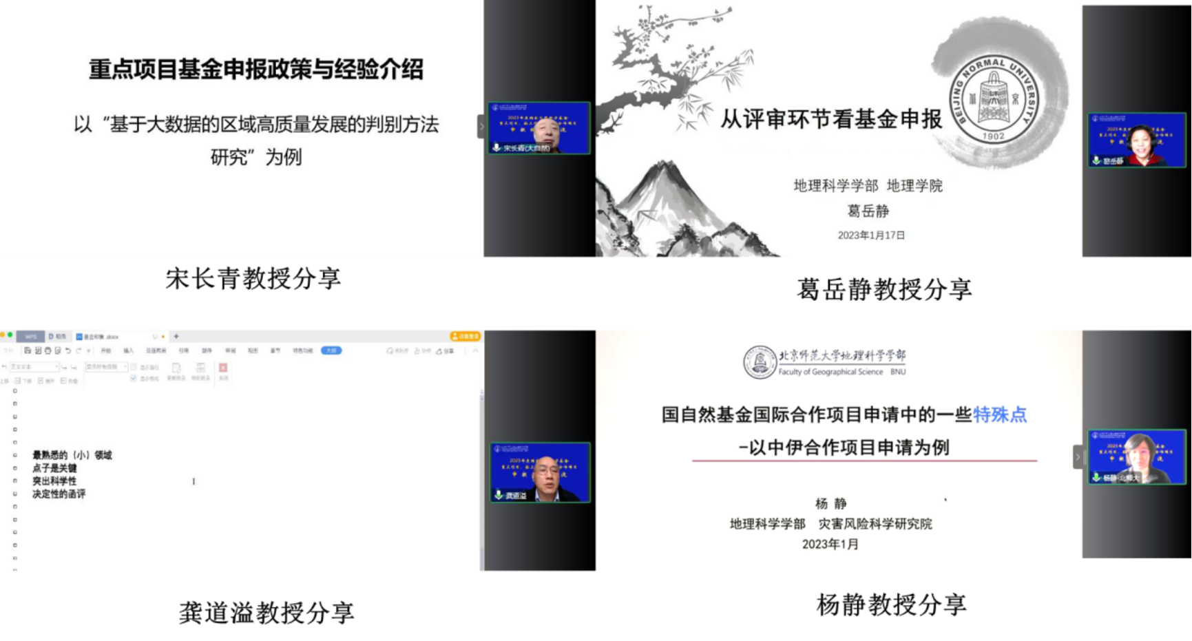 宋长青部长首先作了“重点项目基金申报政策与经验”的报告。报告以获批的重点项目基金“基于大数据的区域高质量发展的判别方法研究”为例,详细分析了领域与题目的选取以及项目申请书各模块内容的撰写。宋部长表示,要做到“有数据、用数据、有方法、有技术、有对象、有区域”,要避免“写太泛、写太宽”。随后,葛岳静教授作了“从评审环节看基金申报”的报告。葛教授从评审的角度,阐述了评审专家如何找亮点、找问题,总结了评审过程中发现的一些普遍问题,特别强调了需避免出现问题地图。接下来,龚道溢教授作了“面上项目申请的一些体会和建议”的报告。龚教授结合自身申报经历,分享了对面上项目的认识、基金申请书内容选择建议,以及申报书撰写要点提示。他建议,要从熟悉的领域入手,牢记点子是关键,突出内容的科学性。最后,杨静教授作了“国自然基金国际合作项目申请中的一些特殊点”的报告。杨教授以获批的中伊国际合作项目为例,系统梳理了国际合作项目不同于重点及面上项目的申报要点和注意事项。她强调,项目负责人的国际合作经历、中外方合作研究内容的互补性、双方已有的研究基础/合作基础,以及申报沟通时的积极互动尤为重要。四位分享人介绍后,线上参会的老师就申报过程中的问题与分享人进行了有针对性的交流与沟通。