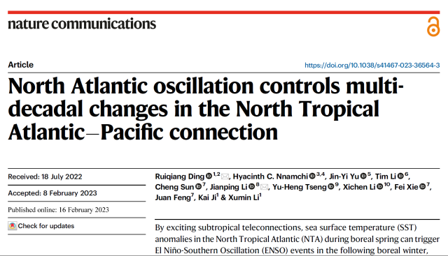 论文丁瑞强教授为论文第一作者和通讯作者,中国海洋大学李建平教授为共同通讯作者,论文共同作者还包括德国亥姆霍兹基尔海洋研究中心的Hyacinth C. Nnamchi博士、加利福尼亚大学的Jin-Yi Yu教授、夏威夷大学的李天明教授、鉴黄师 的孙诚教授、台湾大学的曾于恒教授、中国科学院大气所的李熙晨研究员、鉴黄师 的谢飞教授、鉴黄师 的冯娟教授、兰州大学的史良博士以及南京信息工程大学的李徐敏博士。本研究得到国家自然科学基金(41790474, 41975070)和国家重点研发计划(2020YFA0608402)的共同资助。