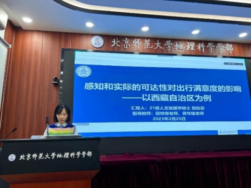 2021级硕士生郭凯菲汇报了青藏科考的研究成果——“感知和实际的可达性对出行满意度的影响——以西藏自治区为例”,向大家展示了偏远地区居民出行活动感知与现实的差异。陶老师针对研究对象分类、图表展示等方面提出修改建议,郑老师指出可进一步思考比较国内外、偏远地区与核心地区的关系,同学们就“感知可达性”的测度、样本年龄跨度等方面进行了交流。
