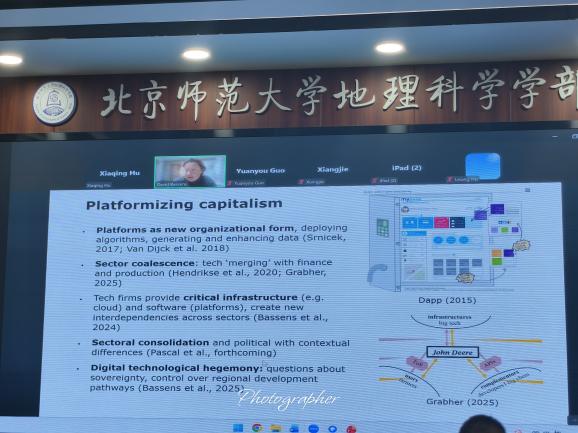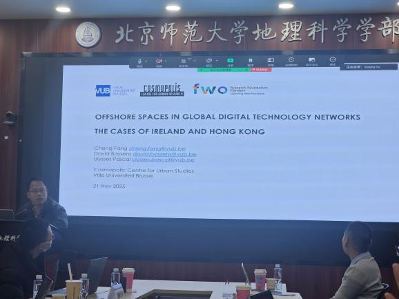 第二个专题由来自杜伦大学的Kanren Lai教授主持,围绕数据中心的研究现状和相关理论展开。北师大博士生王宗相从地理学视角综述数据中心研究现状,来自布鲁塞尔自由大学的David Bassens教授、Ulysses Pascal博士和方成博士围绕全球数字技术网络展开分享。Ulysses Pascal博士探讨了云计算基础设施如何重构主权、监管体系及资本主义的空间组织结构。方成博士以爱尔兰和香港为例,剖析离岸空间的发展轨迹与特征。