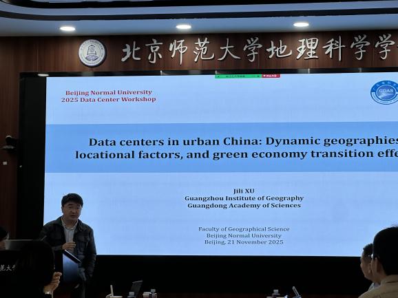 会议设置了三个专题,第一个专题由来自布鲁塞尔自由大学的方成博士主持,围绕数据中心的地理分布展开。中国民航科学技术研究院助理研究员李源向我们描绘了全球数据中心的空间布局演化,广州地理所叶玉瑶教授展示了数据中心的不均衡分布现状和带来的影响,北师大硕士生付舒颖围绕中国数据中心的布局和影响因素汇报,广州地理所助理教授许吉黎从格局、机制切入并讲解了数据中心的绿色经济转型效应。