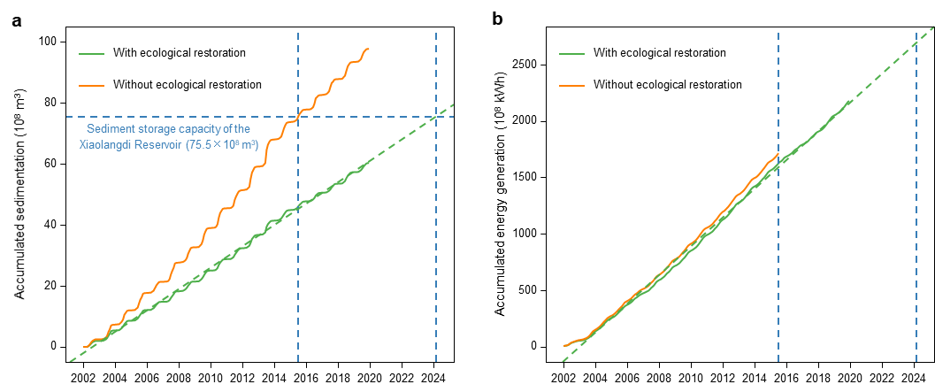 针对这一研究局限,研究团队选择黄河流域为案例,研究流域大规模生态恢复对小浪底水库水电潜力的影响。黄河一度是世界上泥沙含量最大的河流,随着一系列治理措施与生态建设工程的开展,特别是1999年实施退耕还林还草工程后,黄河流域生态环境发生了巨大变化。截至2020年,流域累计造林12.64万km2,种草2.34万km2,修建梯田6.08万km2,建成淤地坝5.81万座。小浪底水库是黄河干流上三门峡以下唯一具有较大库容的控制性工程,控制着黄河流域92.3%的面积、约90%的水量和近100%的沙量,于2001年底主体工程全面完工,总装机容量1800 MW,设计总库容126.5亿m3,其中拦沙库容75.5亿m3。尽管当前研究分析了生态恢复对黄河水沙的影响,但生态恢复带来的输沙和径流同步下降如何影响黄河的水力发电潜力仍未被探索。
