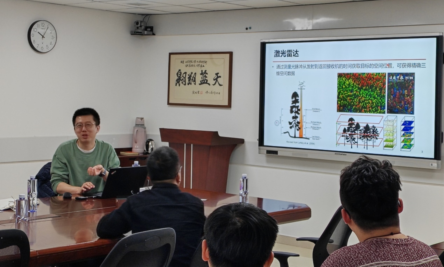讲座结束后,王佩老师、吴秀臣老师及不同专业的同学围绕报告中涉及的数据获取与算法选择、森林冠层结构参数反演的生态学应用等热点与前沿问题与苏艳军研究员进行了热烈地讨论与交流。