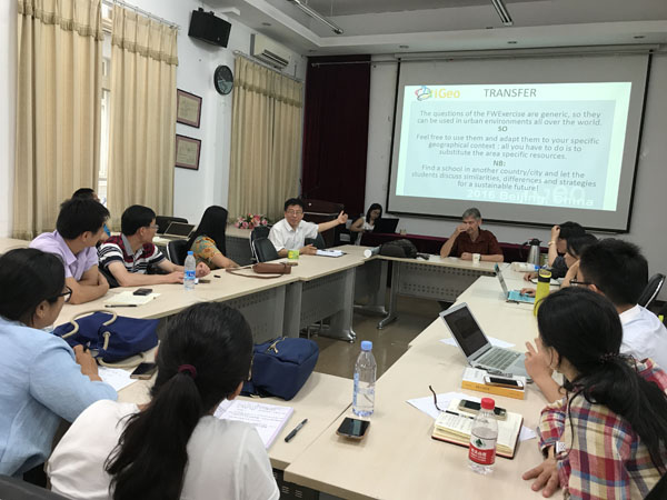 在研究会议中,Henk教授首先介绍了野外考察题目的类型、特征,并对近5年国际地理奥赛野外试题进行了评析。之后,介绍了荷兰地理教育中对野外考察的研究,主要包括野外考察的组织,野外考察题目的开发以及对学生野外技能的评价等。最后,Henk教授组织参会的师生分组并自主选择一个主题,进行野外题目的开发并进行展示。与会师生在Henk教授的报告以及题目开发展示中都进行了热烈的讨论与交流。王民教授对会议进行最后总结,并对Henk教授致以谢意。