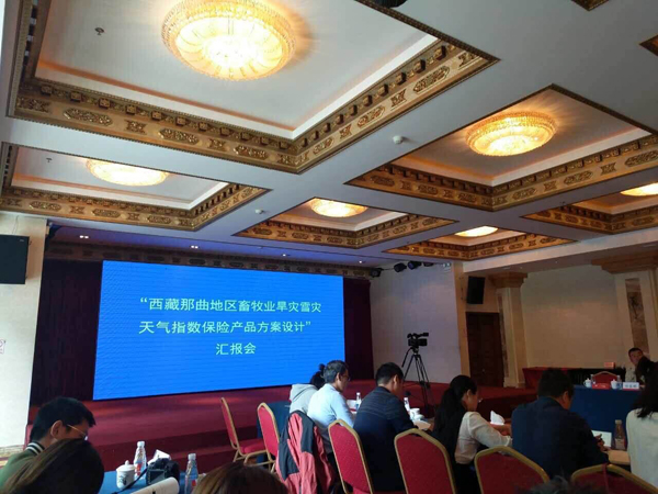 汇报会由人保财险西藏分公司农村保险事业部总经理尹怡炜主持。西藏自治区气象局服务中心气象服务首席专家德庆卓嘎研究员首先介绍了那曲地区气象特点和那曲地区畜牧业旱灾、雪灾天气指数选定情况。减灾院叶涛副教授代表项目组就那曲地区畜牧业雪灾、旱灾天气指数保险产品的设计思路、指数选定、赔付方案、费率厘定以及保费规模等内容进行了详细汇报。