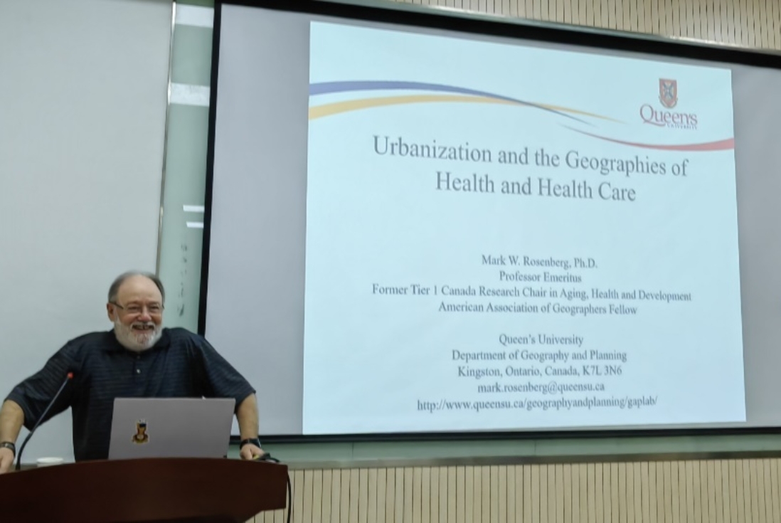 5月15日上午,Mark Rosenberg教授和Maxxwell Harrt副教授开展了第5期和第6期地理学前沿讲座,学部高剑波、张文新、戴特奇、陶卓霖、蒋华雄等老师和多名研究生、本科生参加,讲座由蒋华雄老师主持。Mark Rosenberg教授就“Urbanization and the Geographies of Health and Health Care”主题发表演讲,介绍了全球和中国的城市化进程及未来发展趋势,全方面深入剖析了城市化带来的影响及其与健康和医疗保健之间的关联,围绕此背景下中国面临的三方面挑战展开讨论。Maxwell Hartt副教授发表了题为“Aging Playfully: Expanding the Age-Friendly City”的主题演讲,介绍了当前城市规划中关于游戏研究的局限性,探讨了游戏、公共空间和老年人福祉之间的关系,引导大家思考如何将游戏融入老龄友好相关研究和实践。两场讲座引发了在场同学和老师们的积极问答和深层交流讨论。