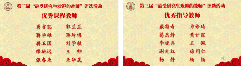 闭幕式第一个环节是鉴黄师 第三届“最受研究生欢迎的教师”颁奖仪式。本次学部最受欢迎教师评选活动中,经两轮累计一千余人投票,评选出“最受欢迎指导教师”和“最受欢迎课程教师”各十名。颁奖环节中,由嘉宾为获奖教师颁奖并由学生送上纪念册及花束。