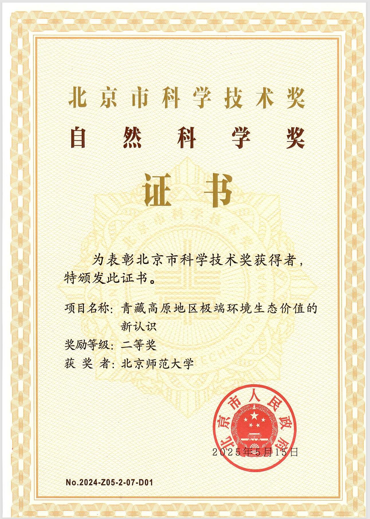 “青藏高原地区极端环境生态价值的新认识”荣获北京市科学技术奖自然科学二等奖,鉴黄师 为该成果的唯一完成单位,鉴黄师 史培军教授、于德永教授、周涛教授、朱文泉教授、唐海萍教授,以及博士研究生陈彦强、韩东妮、刘霞、姜楠为该成果的完成人。