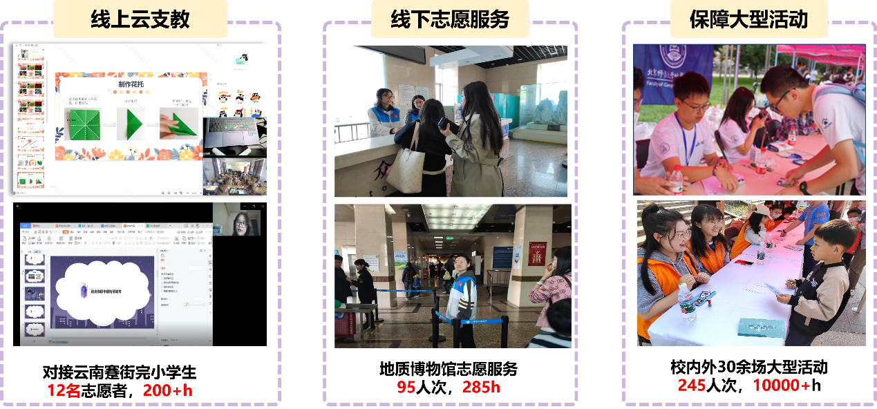 在多元赋能淬炼方面,志愿服务引领文明新风尚,延续“美丽中国”线上云支教、与地质博物馆合作开展线下志愿服务、为校内外大型活动提供保障。权益服务营造参与文化,畅通线上线下多渠道,用好代表大会制度,直面难题、深入调研。