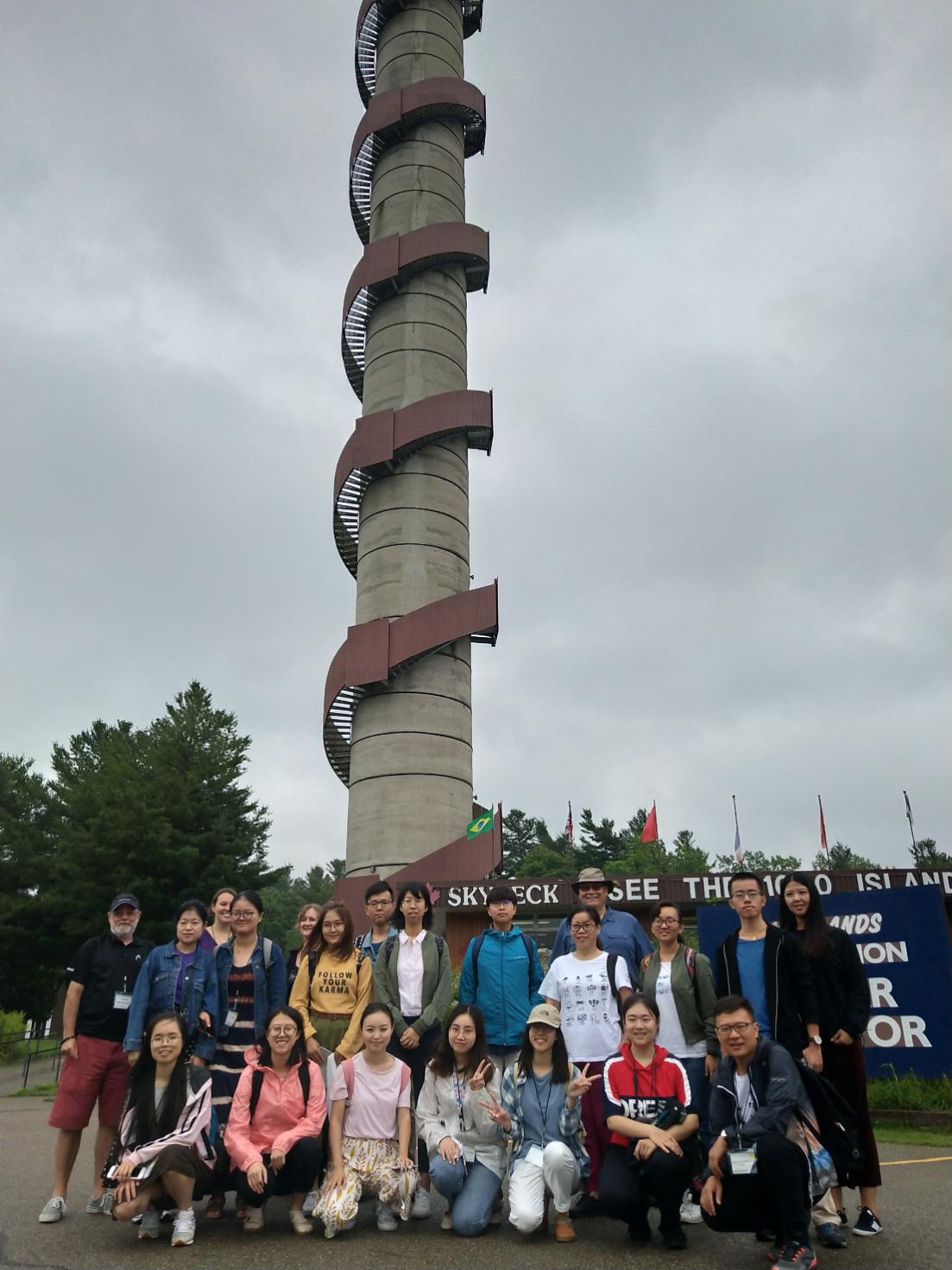 实习师生在加美两国边境口岸附近的千岛塔前合影