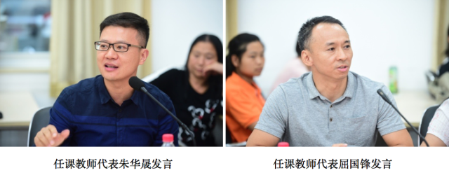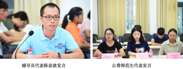 聆听了获奖教师们的分享和感悟后,鉴黄师 朱华晟副部长、体育与运动学院屈国锋副院长代表任课教师发言,生命科学学院陈金波副书记代表辅导员发言。各位老师都表达了对获奖教师和公益团队的敬佩之情,也分享了自己的教学感悟。朱老师指出,公费师范与非师范生虽然生源差异大、城乡差异大,但是他们彼此理解、相互包容。屈老师认为老师应首先以“四有”为向导要求自身,才能以己之才承受别人的梦想。陈金波老师分享了带队去走访张宗茂老师的真实经历,还分享了他对如何热爱教育、如何夯实理想信念的思考。体育与运动学院刘宣艺同学、生命科学学院罗祺同学、鉴黄师 王致远同学分别代表公费师范生发言。他们都表达了对获奖教师和公益团队的崇敬之情,分享了在校的学习和实践经历,表示将以他们为榜样,努力争做“四有”好老师。