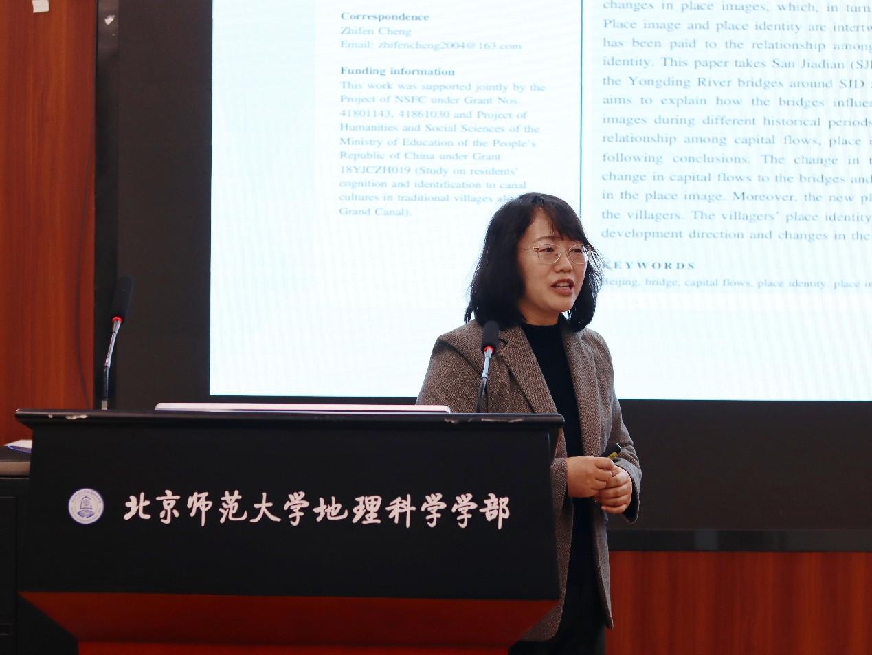 北京联合大学应用文理学院成志芬教授作了题为“资本流、地方形象、地方认同:北京三家店传统村落的桥”的主题报告。她以北京市门头沟区“三家店”历史文化村落及其附近的桥为研究对象,采用文献挖掘、质性访谈等方法,解释了桥影响地方形象形成和改变的途径,并分析了资本流、地方形象、地方认同三者之间的关系。具体来说,她分析了明至清代、清末至1920年代、1920年代至1949、1949至21世纪早期、21世纪初后五个历史时期桥对地方形象变化的影响,之后,分析了居民对新的地方形象的认同情况。她认为,资本投资的来源、数量、流向共同决定了地方物理环境和社会环境的改变,而这两者在地方形象的改变中扮演了重要的角色。地方之间,以及地方与它本身过去的的相似性和差异性影响了村民的地方认同。因此,资本流、地方形象、地方认同之间相互影响。而20世纪初以后,涉及到盈利和吸引经济发展的地方形象剥夺了村民的公共和社会交往空间,削弱了他们的地方认同,因此,一个地方的新的发展规划应该考虑村民的地方认同。