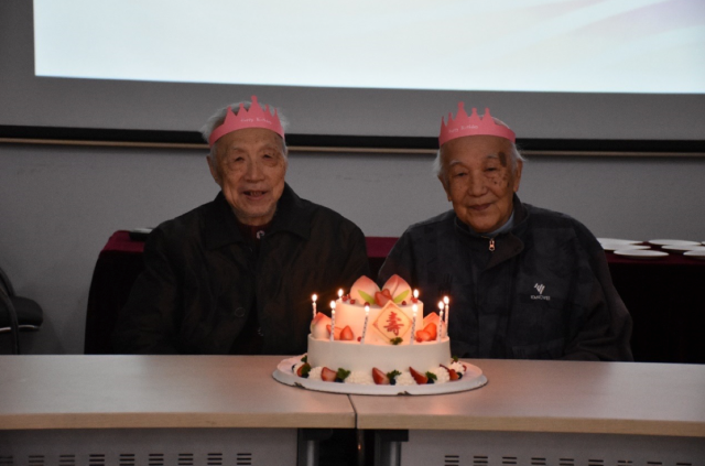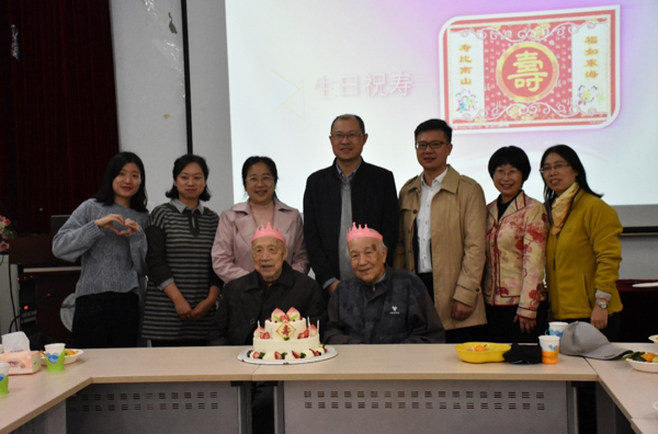 屋外虽刚下过绵绵细雨,屋内却气氛火热。在生日祝寿环节,大家为时值90岁的李文华、张如意老师和时值88岁的邬翊光、李华章老师送上生日祝福歌,到场的寿星们共同吹灭蜡烛,大家在甜蜜的蛋糕中一同送上祝福,气氛温馨。