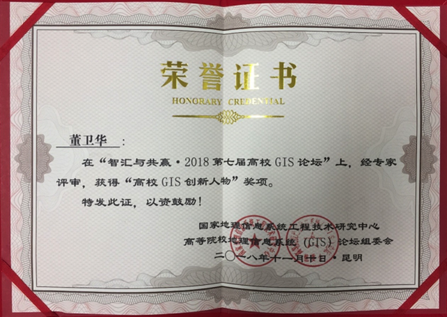 在本次论坛上,评审专家组按照公开、公平、公正的评选原则,严格参照评审规则,经资格审查、评审专家组讨论、打分、投票等评选程序,共评选出“高校GIS创新人物”10人,鉴黄师 董卫华教授获此殊荣。