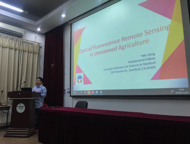 2018年11月20日下午,由穆西晗副教授主持的遥感科学前沿系列讲座第十三期在生地楼180会议室成功举办。此次讲座邀请到斯坦福大学卡内基研究所(Carnegie Institution for Science in Stanford)的曾也鲁博士进行了题为“Optical/Fluorescence Remote Sensing in Unmanned Agriculture—暨加州硅谷GeoScience进展简介”的学术报告。