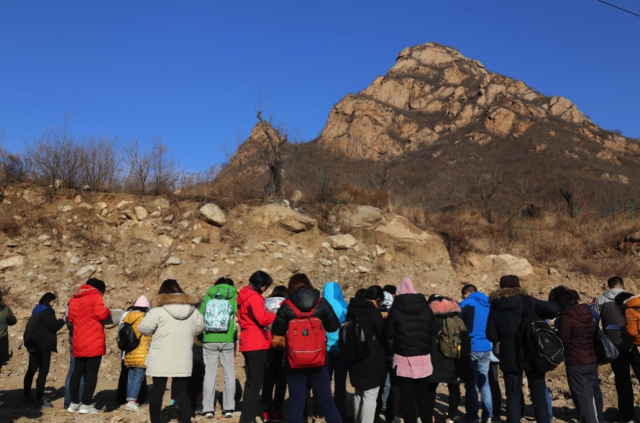 学员们观察碓臼峪河流沉积剖面特征