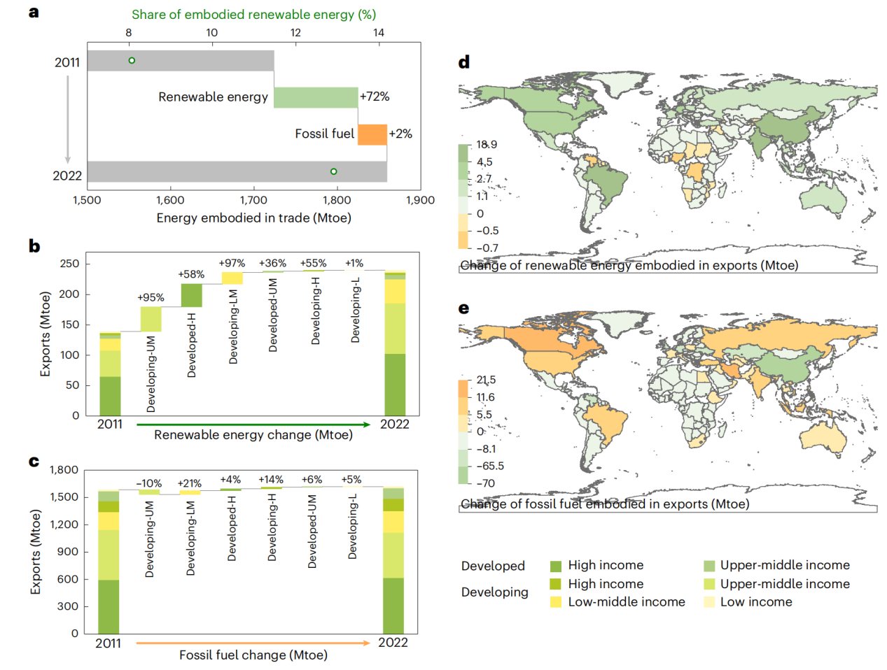 基于该数据库,该研究核算了2011-2022年全球贸易隐含的可再生能源总量,解析了5类不同国家商品贸易隐含的可再生能源与化石能源的动态平衡机制,揭示了隐含可再生能源转移的产业路径与产业能源结构演变。研究发现,全球贸易呈现清洁化趋势,全球隐含可再生能源出口从139 Mtoe增至240 Mtoe,增幅达72.4%,占隐含能源出口总量的比例从8%提升至13%。发展中-中高收入(developing upper-middle income)国家是贸易清洁化的主要推动者,中国是全球隐含可再生能源出口增量和隐含化石能源出口减量最大的国家,隐含可再生能源出口增量占全球总增量的19%。这一发现为理解中国对全球的绿色贡献提供了关键科学证据。