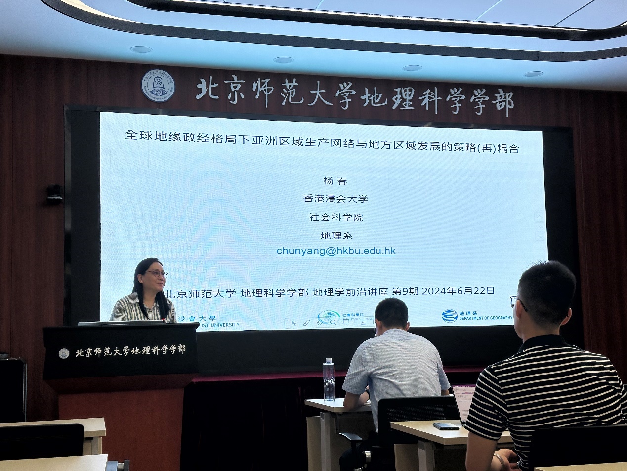 2024年6月22日下午,地理学前沿讲座第10期在生地楼180会议室成功举行。本次讲座由潘峰华教授主持,特邀香港浸会大学社会科学院地理系杨春教授以“全球地缘政经格局下亚洲区域生产网络与地方区域发展的策略(再)耦合”为主题进行学术报告。学部高剑波教授、张华副教授、蒋华雄老师、郑龙飞老师等老师和人文地理学研究生参加。