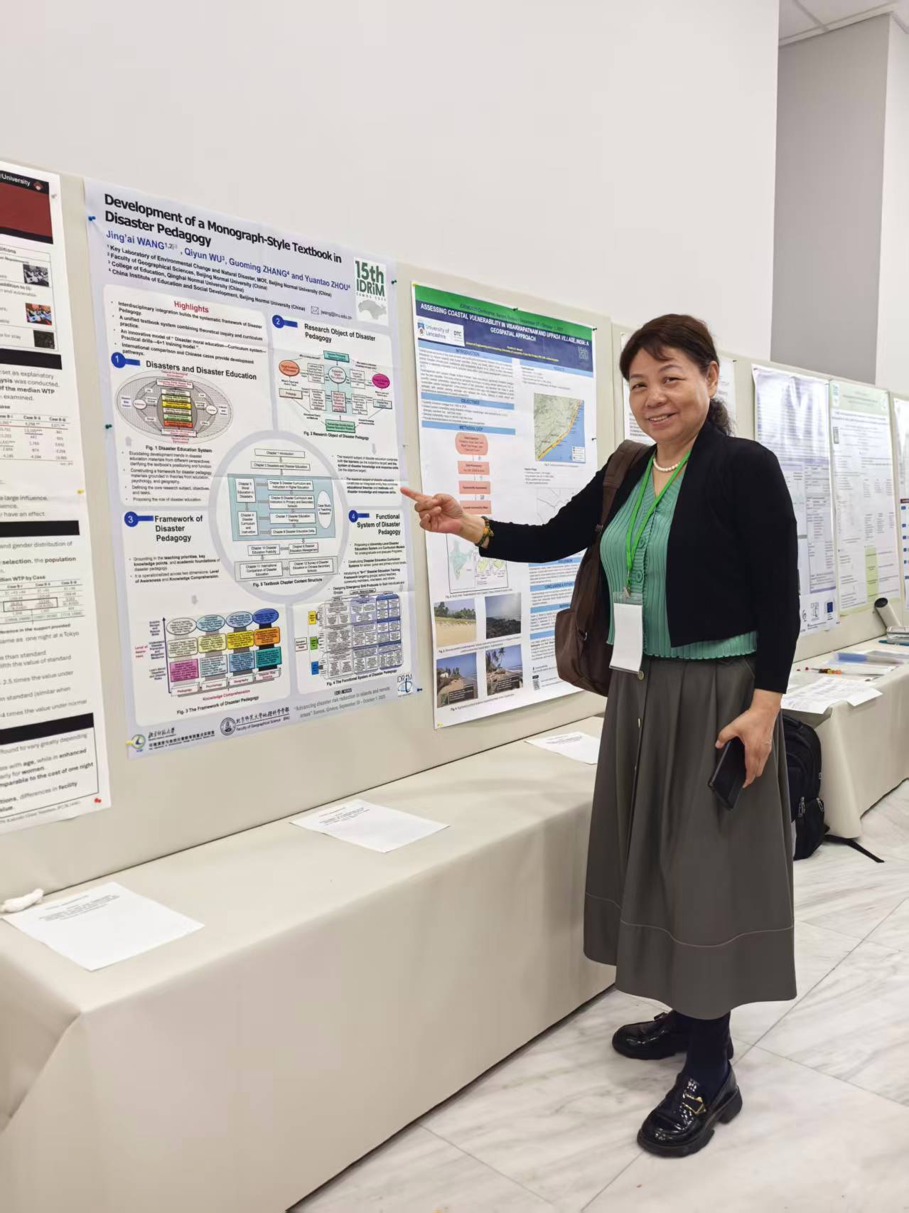 王静爱教授进行了题为“Development of a Monograph-Style Textbook in Disaster Pedagogy”的海报展示。该研究系统构建了灾害教育学的理论框架与课程体系,创新性编写了首部面向研究生层次的灾害风险教育专著教材,提出了灾害教育的核心功能与实施路径,建立了涵盖学校教育、专业群体培训与多主体参与的完整课程与管理体系,对推进我国灾害风险防范教育、提升公众防灾减灾意识与能力具有重要的现实意义。