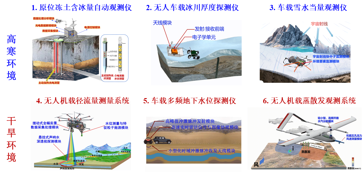 1.研制极端生态环境(高寒、干旱)水循环关键参量监测设备6套(图2),每套设备样机2台。包括:原位冻土含冰量自动观测仪(绝对误差小于0.05m3/m3),无人车载冰川厚度探测仪(绝对误差小于0.5m)、车载雪水当量观测仪(绝对误差小于10mm)、无人机载径流量测量系统(绝对误差小于5m3/s)、车载多频地下水位探测仪(绝对误差小于20cm)和无人机载蒸散发观测系统(绝对误差小于4×10-6 mm/s),其中用于高寒和干旱环境地面监测设备的无故障运行时间>720小时,机载监测设备的无故障运行时间>120小时;