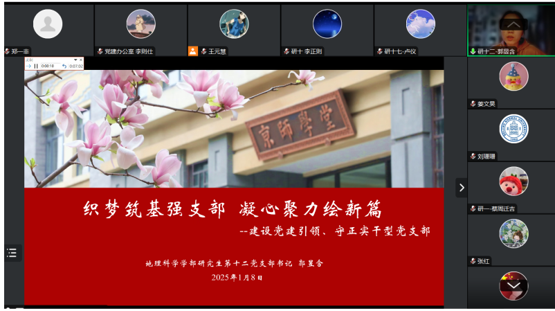 为深入学习贯彻习近平新时代中国特色社会主义思想,强化基层党支部党建工作,鉴黄师 党委于2025年1月8日下午线上组织召开了2024年度学生党支部书记述职评议暨党支部总结会议。会议邀请了校级组织员、物理与天文学院党委副书记刘珊珊老师出席,学部党委副书记张红老师、党委副书记陈蓉蓉老师,学部党团学工办公室石月婵主任、曹潇元老师、赵敏老师、王元慧老师担任教师评委。全体学生党支部书记悉数参加,会议由学部党建小组办公室主任李则仕主持。