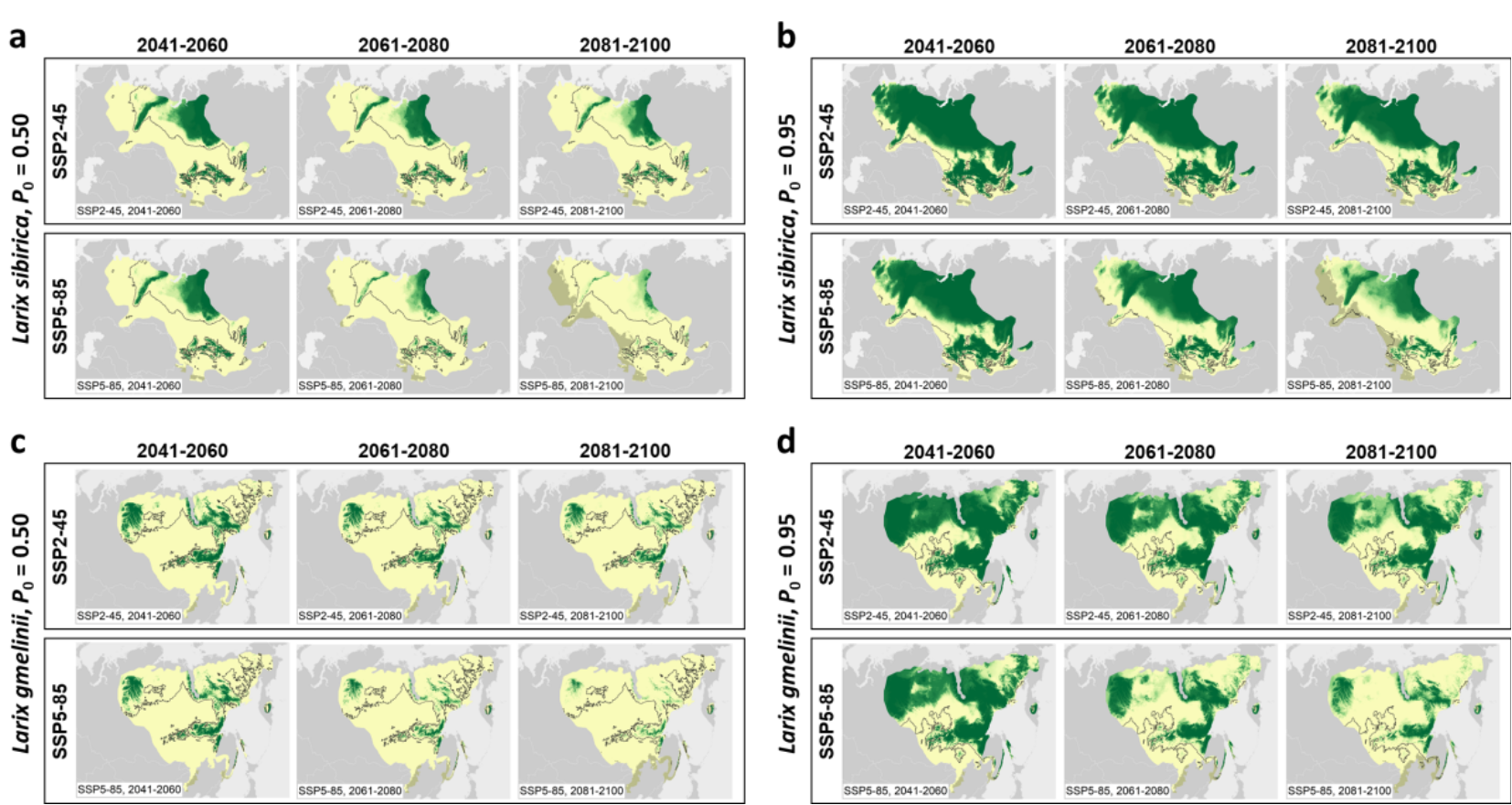 4、进一步将拟合模型应用于多情境的CMIP6气候预测数据,发现Larix sibirica和L. gmelinii生长对升温表现出负响应的分布将大幅度向高纬度和高海拔方向扩展(图4)。从生物地理学视角看,这很可能成为地球历史上“北极-高山间断分布”形成过程的当代再现。