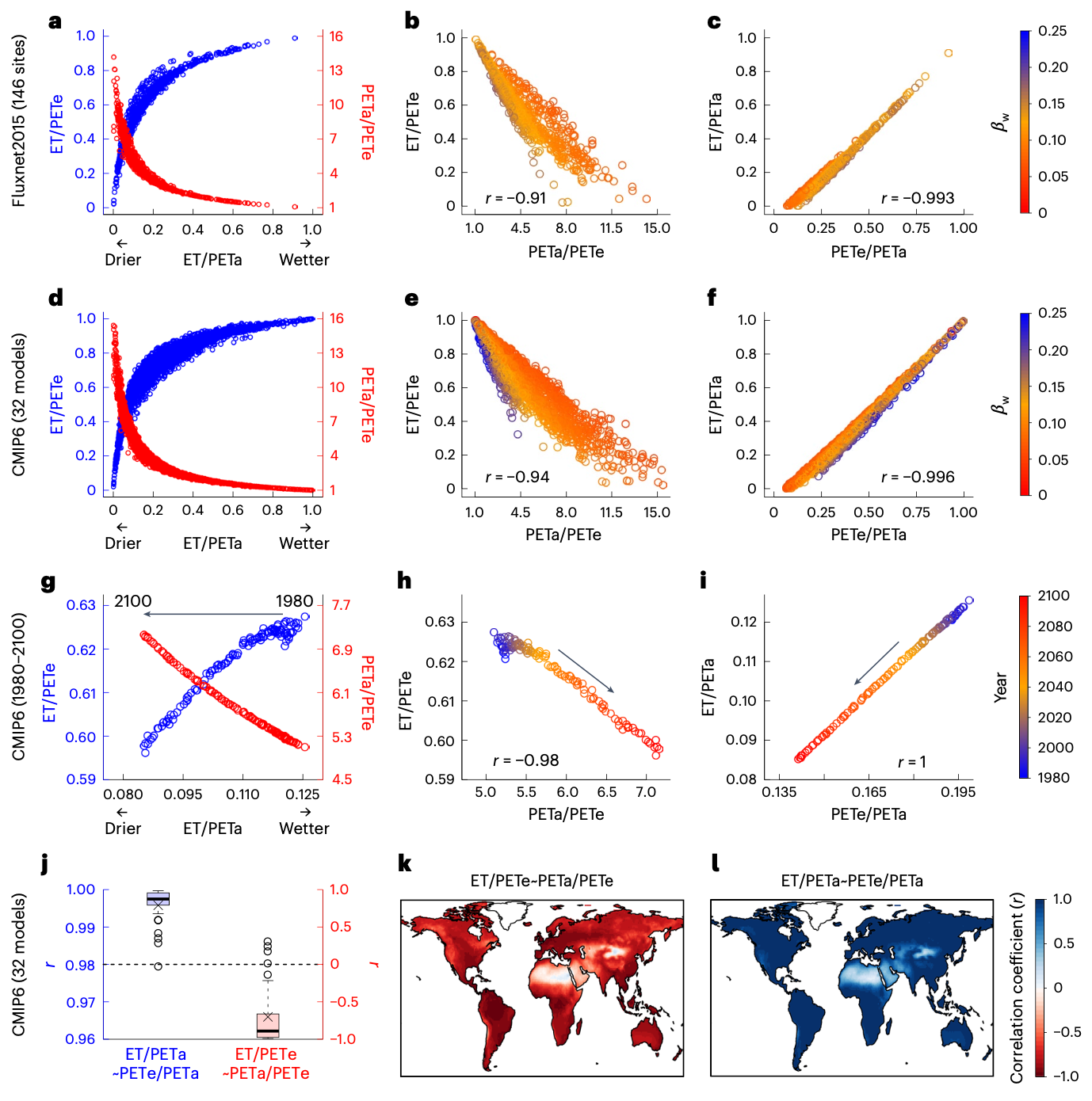 图1. 观测和模拟验证表明,ET与PETe呈正相关,而与PETa呈负相关