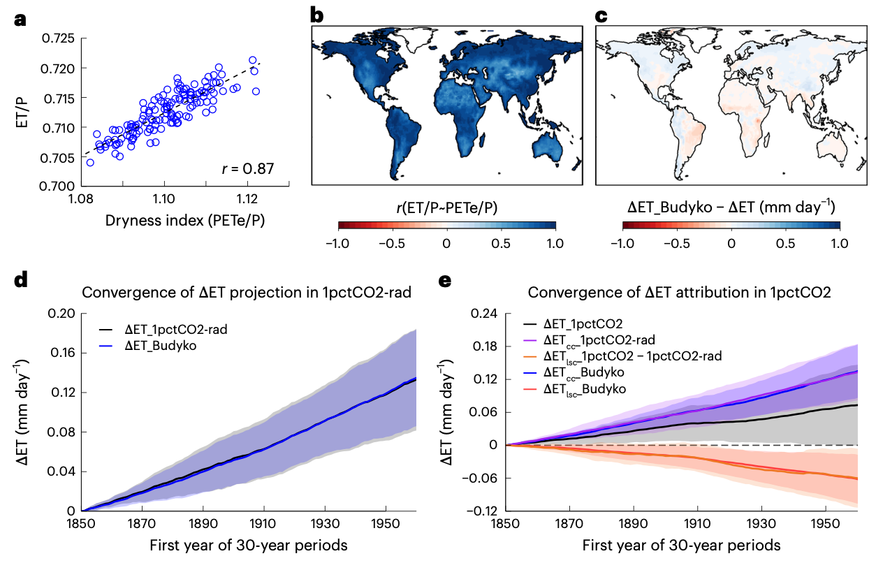 图2. 基于PETe的离线水文模型(Budyko框架)与地球系统耦合模型在蒸散发变化预估和归因中的一致性