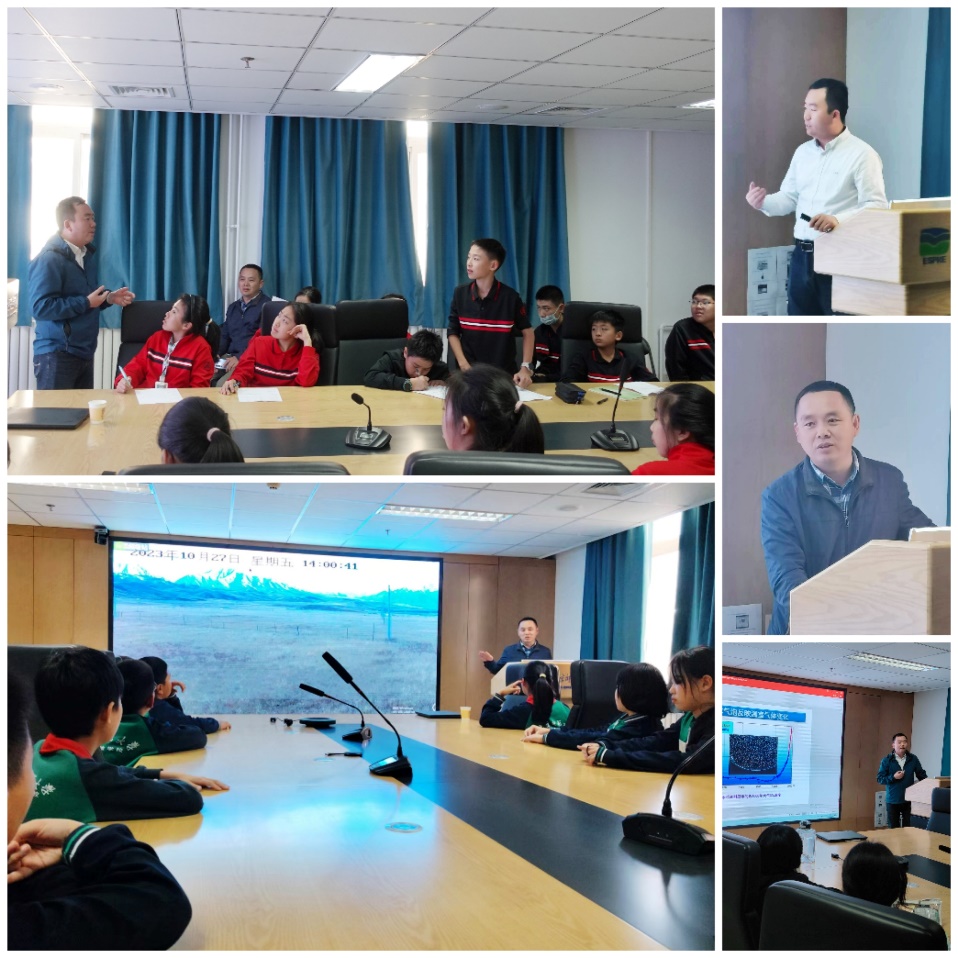 在黑河地表综合观测系统和冰芯研究介绍环节,徐自为老师详细介绍并展示了实验室搭建的黑河流域地表多要素实时监测系统。从数据采集、传输、汇总和汇交以及野外观测场实时监控,同学们都惊叹监测系统的先进及建设监测系统的不易。苏勃老师给同学们做了题为“走进冰芯记录的气候变化”的科普报告,深度解读了冰芯的环境记录信息、结构特点、野外采样、和室内分析及如何利用冰芯探究万年前的气温和二氧化碳变化。苏老师结合法国冰川学家克劳德·洛里乌斯的在南极考察时意外发现冰芯气泡的事迹,启发学生科学就在身边,要善于观察和思考,并结合“巴黎协议”温控目标和我国“双碳”目标,渗透了全球变暖中的个体责任意识。