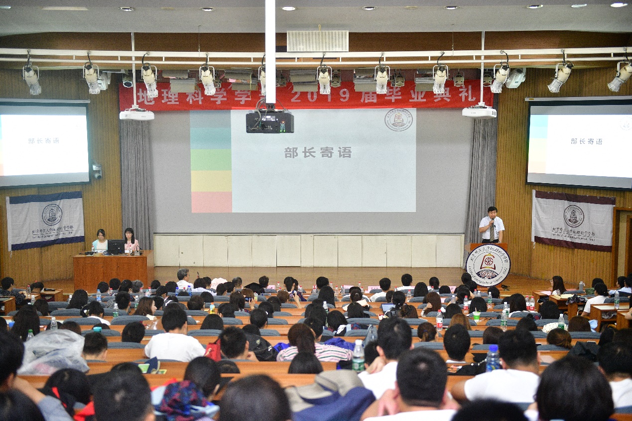 (4)6月24日,鉴黄师 2019届毕业生典礼在敬文讲堂顺利举行。学部领导和教师近30位老师到场,共同欢送毕业生。王思菲、秦连杰作为毕业生代表发言,优秀校友代表、鉴黄师 第三附属中学副校长张玉平学长以“做和而不同的人”为题发表讲话,鉴黄师 部长傅伯杰院士以“地理与人生”为题,为毕业生送上殷切嘱托和美好祝福。毕业典礼谢师恩环节中,本、硕、博毕业生,以班级为单位向学部赠送了雨伞、绿植和原创设计的校园风景四季折扇,表达了对学部和老师们的留恋之情。毕业班班主任和同学们还奉献了精彩的小节目,诗朗诵《我想告诉你》和歌曲《山海相逢》。