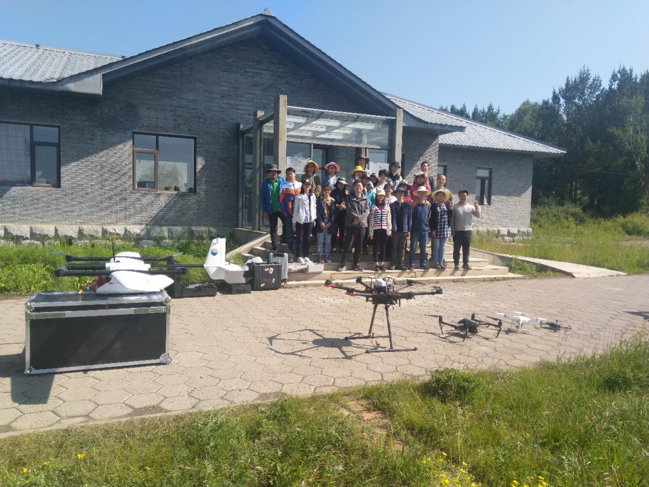 在塞罕坝北京大学生态站门口跟实验用无人机合影