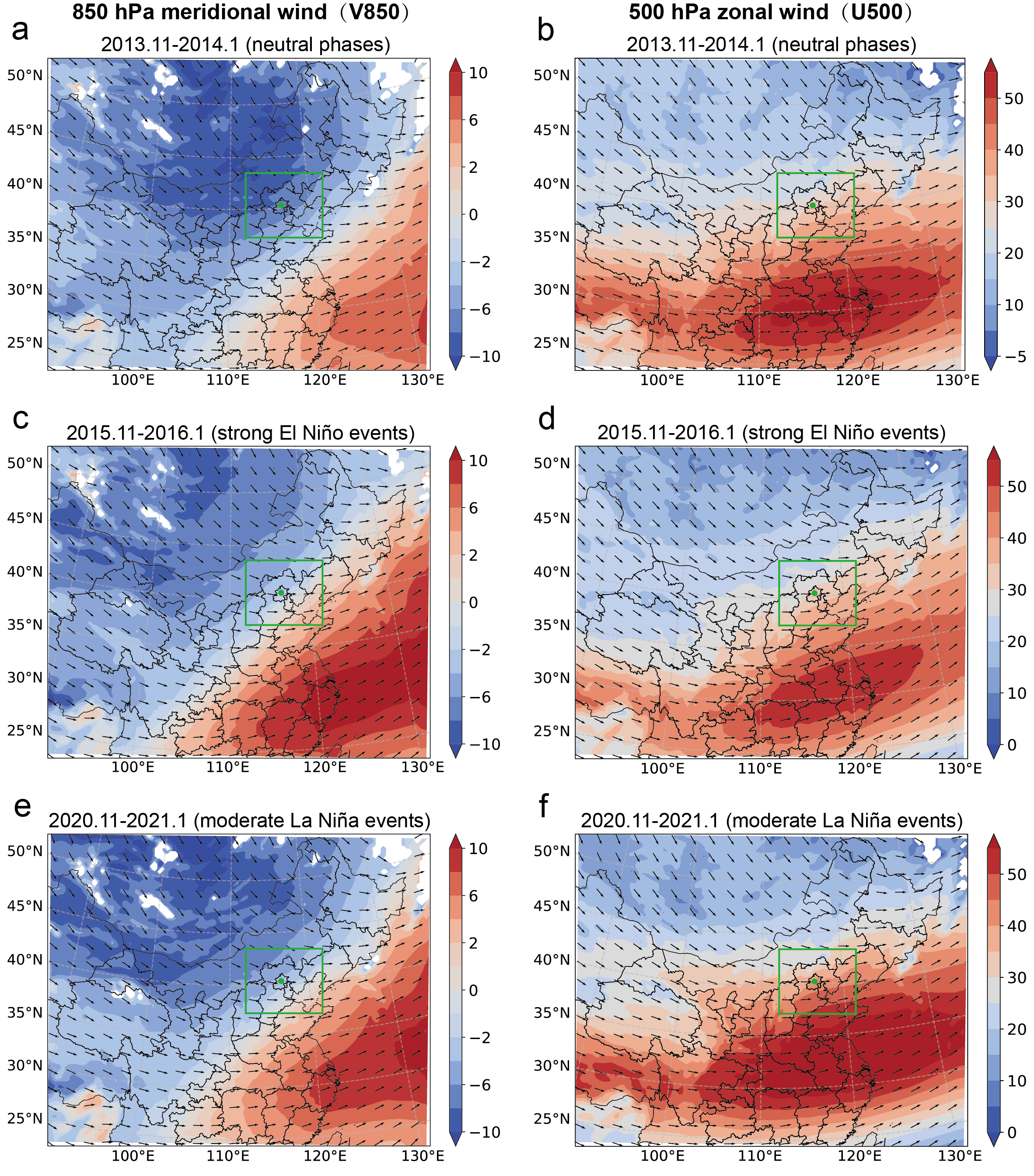 图2. 不同ENSO相位下大气不同高度的风场分布。a-b:正常年份;c-d:强厄尔尼诺冬季;e-f:中等强度拉尼娜冬季。a、c、e为850 hPa高度的经向风场特征,b、d、f为500 hPa高度的纬向风场特征。色阶表示风速(单位:m/s),箭头仅示意风向。绿色圆点标注北京位置,绿色框突出显示北京及周边区域。