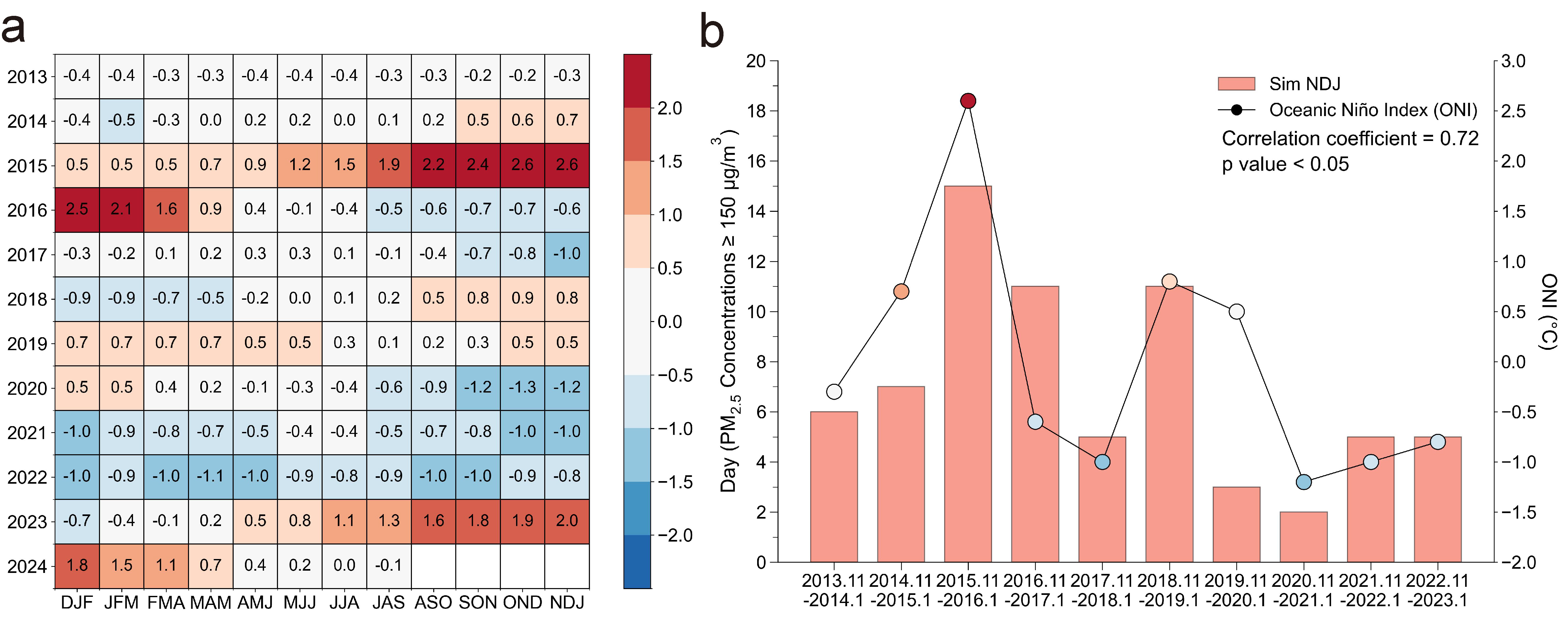 图1. ENSO和北京HPF之间的相关性分析。a:2013至2024年中东热带太平洋(Niño 3.4区域)海表温度距平的三个月滑动平均值,采用海洋厄尔尼诺指数(ONI)表示。b:ONI与HPF相关性对比。b图中圆点颜色与a图中NDJ一列保持一致。