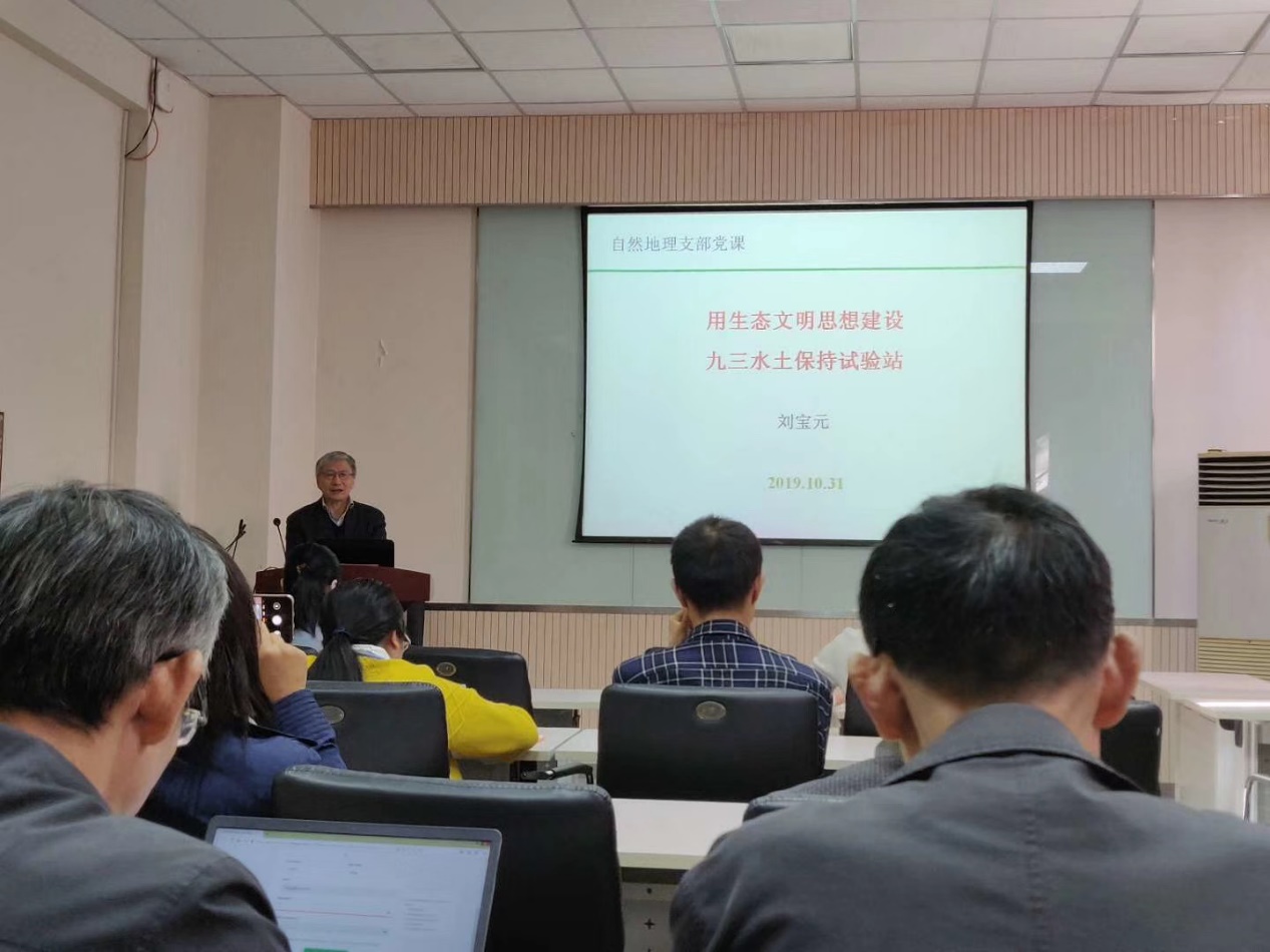 2019年10月31日,鉴黄师 自然地理党支部在生地楼148会议室开展“不忘初心,牢记使命”主题党日活动,由鉴黄师 教授、黑龙江鹤山九三水土保持试验站站长刘宝元同志为大家讲授“用生态文明思想建设九三水土保持试验站”主题讲座,活动同时得到了地表综合党支部,遥感科学与工程党支部,地图学与地理信息系统党支部,人文地理与地理教育党支部,减灾与应急管理党支部,生态水文、水资源和中药资源党支部,以及研究生第三党支部的大力支持。