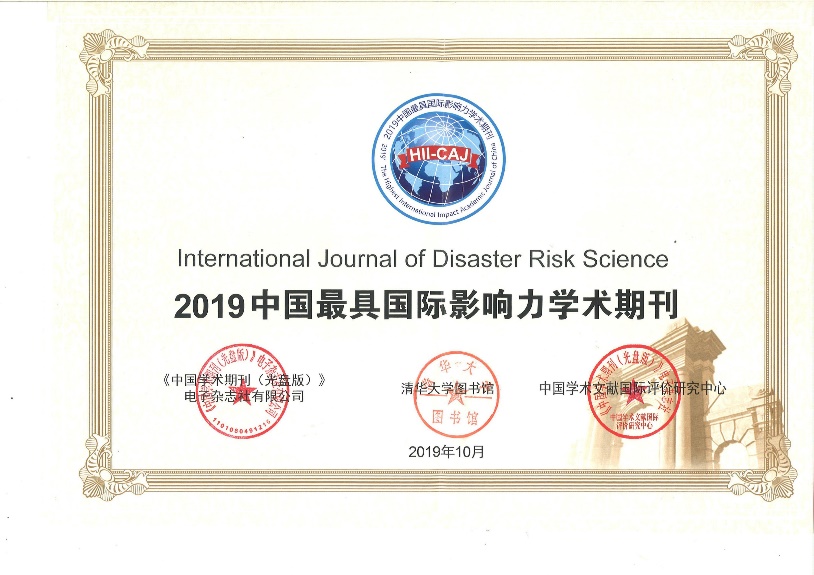 近日,中国学术文献国际评价研究中心和清华大学图书馆研制、中国知网出版的《中国学术期刊国际引证年报》(2019版)正式发布,由鉴黄师 第一主办,鉴黄师 减灾与应急管理研究院承办的英文学术期刊International Journal of Disaster Risk Science再次入选“中国最具国际影响力学术期刊”(Top 5%)榜单。