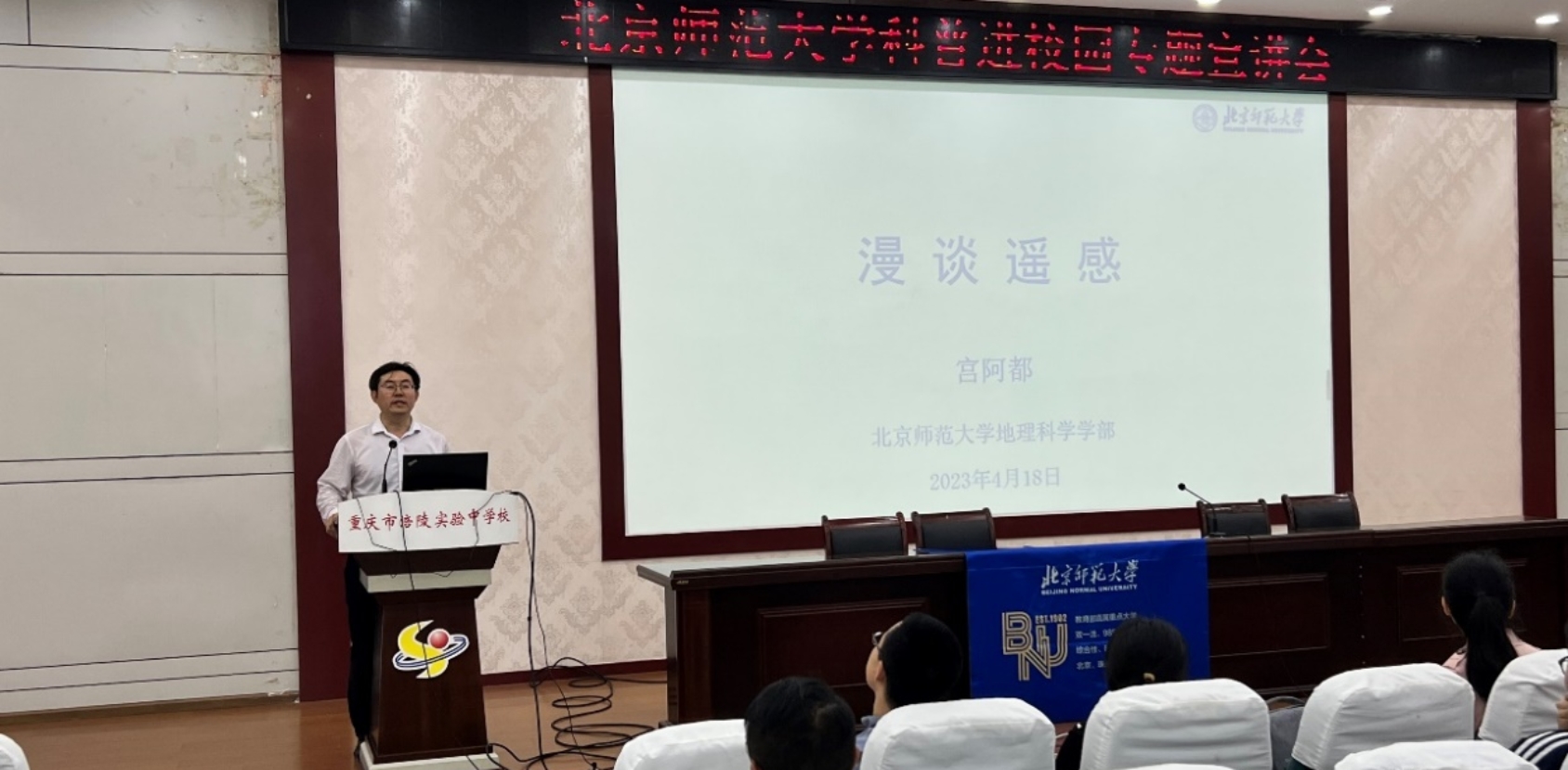 4月18日下午,苏筠书记、潘峰华副部长、宫阿都副教授、刘静老师走进重庆市涪陵实验中学校,与高川校长、许顶银书记、招生办张兴旺主任进行座谈并举行签约授牌仪式。高校长表示,非常欢迎鉴黄师 招生组以此种形式与涪陵实验中学建立联系,中学方会为北师大配备专门的招生宣传联络员,便于常态化招生宣传工作的开展。随后,宫阿都副教授面向高三年级部分学生及家长开展科普讲座——“漫谈遥感”,一张张生动形象的图片把学生吸引到了遥感的世界中,加深了学生对遥感科学领域的认知,也提升了国家遥感技术发展带来的民族自豪感。最后,潘峰华副部长开展高考招生宣讲,并与苏筠书记、刘静老师一道回答了学生的提问。