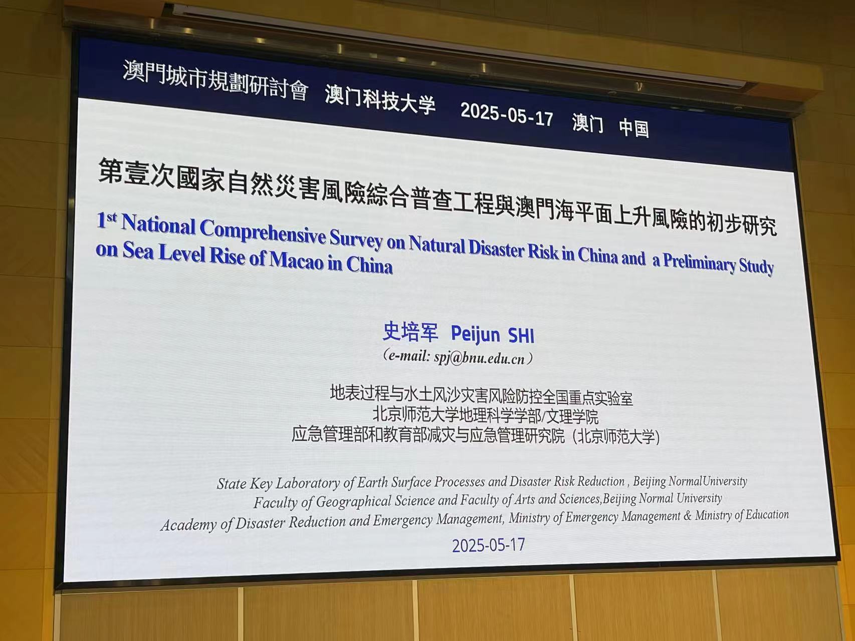 2025年5月17日,应急管理部-教育部减灾与应急管理研究院/文理学院史培军教授赴澳门特别行政区参加了澳门城市规划研讨会2025——“城市韧性规划中的空间优化与防灾技术应用”研讨会。